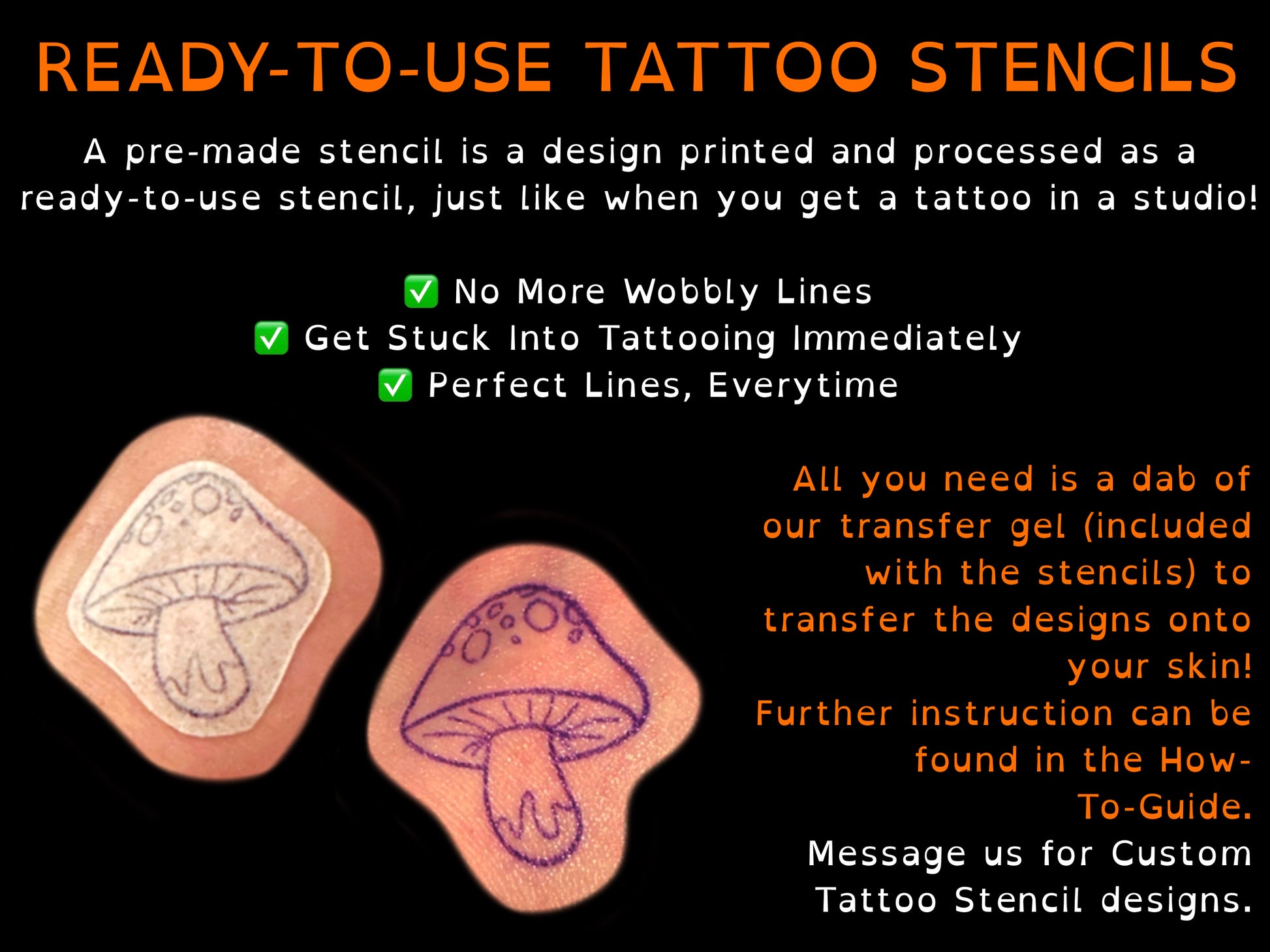 A pre-made stencil is a design printed and processed as a ready-to-use stencil, just like when you get a tattoo in a studio!