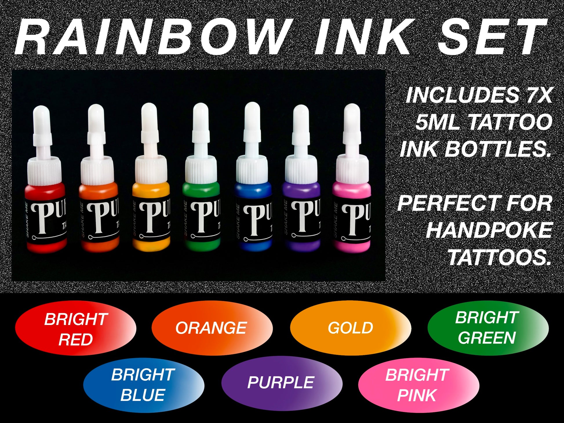 This specially formulated set includes Bright Red, Orange, Gold, Bright Green, Bright Blue, Purple, and Bright Pink, each with a perfect consistency for handpoke tattooing.